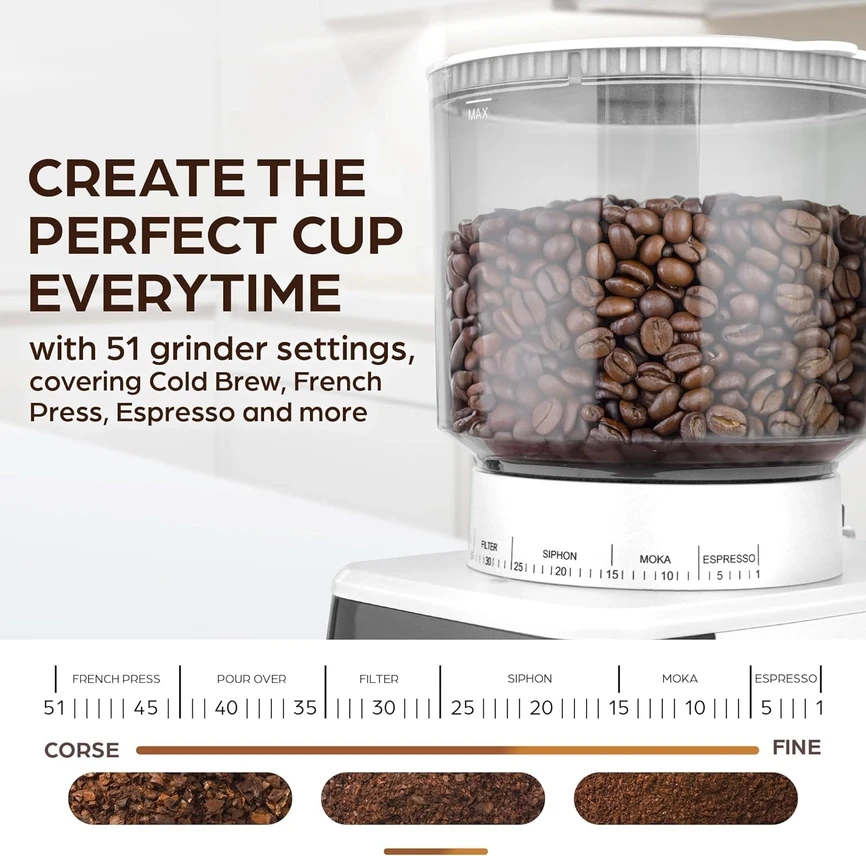 51 Grind Settings: Choose from fine espresso to coarse French press grinds, ensuring the perfect texture for any brewing method.