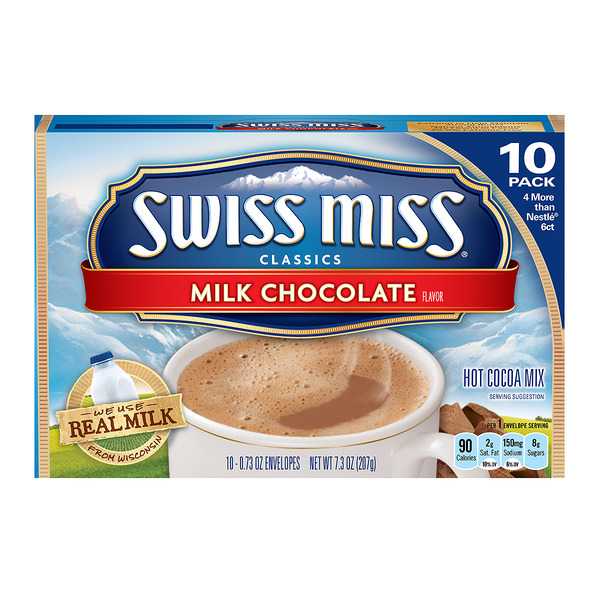 Details: Swiss Miss Classics Milk Chocolate Hot Cocoa Mix is the warm, creamy, and delicious beverage that has delighted kids for generations. Made with real milk, Swiss Miss Classics Milk Chocolate Hot Cocoa Mix has the timeless flavor that moms know and kids love. Swiss Miss Classics Milk Chocolate Hot Cocoa Mix contains wholesome chocolate taste in every cup. After a long day of work or play, enjoy a moment of delicious relaxation with a cup of Swiss Miss Classics Milk Chocolate Hot Cocoa Mix. Each 0.73-ounce packet of Swiss Miss Classics Milk Chocolate Hot Cocoa Mix contains 90 calories, 11 grams of sugar, and 1 gram of protein. This pack contains 8 boxes. For more than 50 years, Swiss Miss has been creating its signature blends in a real dairy in Menomonie, Wisconsin. Packaged here in the USA starting from farm-fresh milk, every cup of Swiss Miss has real, wholesome taste in every sip.
