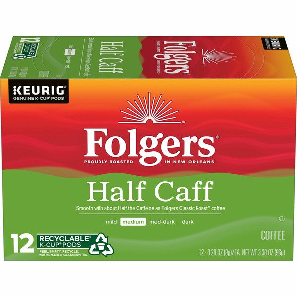 Details: Less caffeine doesn???t have to mean less coffee. Enjoy the distinctive flavor and aroma you love with Folgers Half Caff Coffee. This flavorful and smooth medium roast coffee has about half the caffeine of Folgers Classic Roast Coffee for a gentler wake up call. And because each serving is conveniently packaged in genuine Keurig K-Cup pods, you can brew a mug of deliciously satisfying coffee with the touch of a button using virtually any Keurig coffee maker. No measuring and no filter means you can spend less time making your coffee and more time enjoying it as you gear up for another great day.