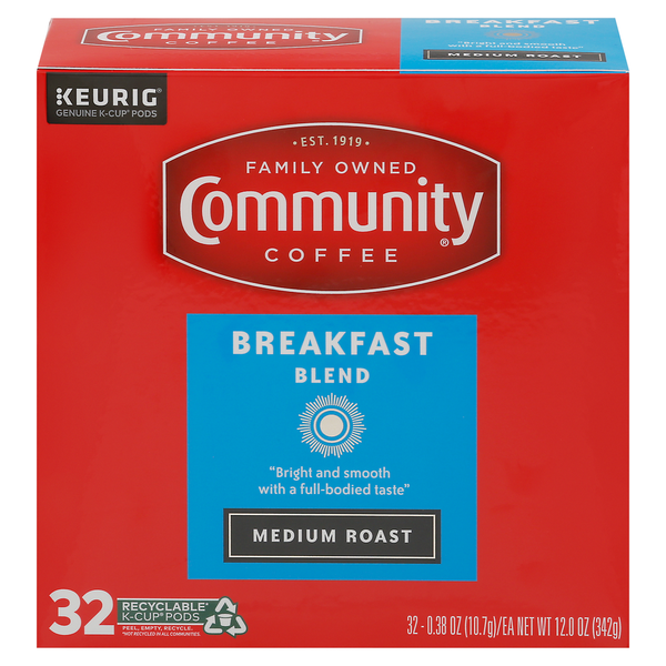 Details: Keurig - Genuine K-Cup pods. Est. 1919. Family owned. Bright and smooth with a full-bodied taste. Our Story: Over 100 years ago my great-grandfather, Cap Saurage, created the very first batch of our signature coffee. He blended and served a cup so delicious that it became a local favorite. Out of appreciation for his community of friends and customers, Cap named it Community Coffee. Four generations later, we are dedicated to creating a variety of distinctive, full-flavored coffees. We blend and roast each coffee to reach its full potential, giving you a rich, smooth coffee experience every time. - Matt Saurage, 4th Generation Owner. Only Genuine K-Cup Pods are optimally designed by Keurig for your Keurig coffee maker to deliver the perfect beverage in every cup. Breakfast Blend: We purposefully source the beans of our Breakfast Blend to highlight the full-bodied flavors of South and Central America. We then carefully roast them to bring out notes of honey and hazelnut, developing a rich, smooth flavor that will make the first cup of the day your favorite. Recyclable (Not recycled in all communities) K-Cup Pods. Peel, empty, recycle. Not recycled in all communities. Peel: Starting at puncture, peel lid and dispose. Empty: Compost or dispose of grounds. (Filter can remain). Recycle: Check locally (Not recycled in all communities) to recycle empty cup. Visit Keurig.com/recyclable to learn more. Making a Difference Cup by cup: We believe it is important to do more than make great coffee. By supporting and giving back to local communities, every cup makes a difference to the people and places that make us Community Coffee. To learn more, visit CommunityCoffee.com/Giving-Back. Proof of Purchase: Community Coffee cash for schools - 2 points. CommunityCoffee.com/CashforSchools.