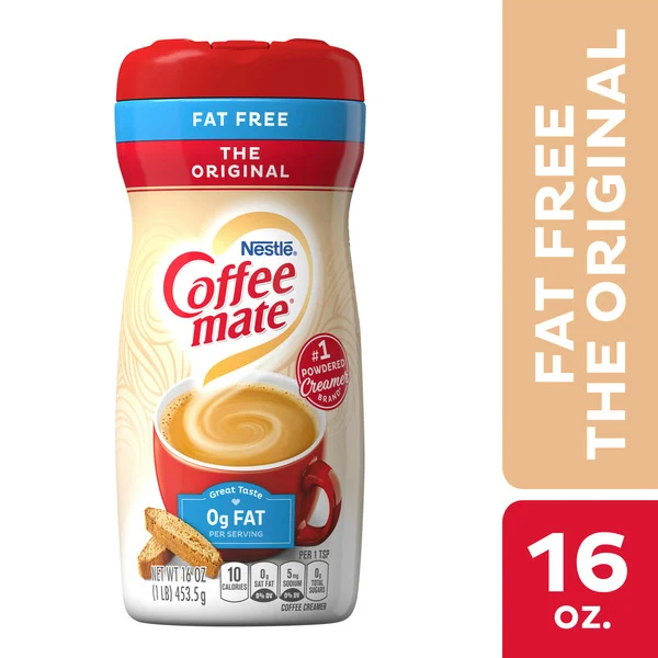 Details: Nestle Coffee mate Original Fat Free Powdered Coffee Creamer is an ideal way to create a delicious cup of coffee perfection. Smooth and rich, this Coffee mate original creamer delivers a warm, rich flavor that transforms every drinking experience. Coffee mate fat free creamer is also lactose free, gluten free and non dairy. Coffee creamer powder makes it easy to pour, stir and enjoy the exact amount into your prepared coffee for a delicious, flavorful cup. This classic flavored coffee creamer is the perfect way to wake up your coffee, whether it's your morning cup or an afternoon pick-me-up. Store Coffee mate powder creamer in a cool, dry place.
