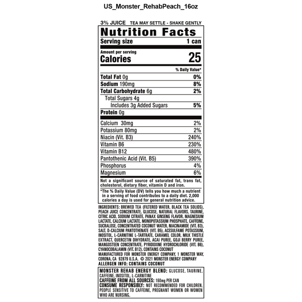 Ingredients: Brewed Tea (filtered Water, Black Tea Solids), Glucose, Peach Juice Concentrate, Taurine, Citric Acid, Sodium Citrate, Phosphoric Acid, Panax Ginseng Extract, Magnesium Lactate, Calcium Lactate, Caffeine, Monopotassium Phosphate, Acesulfame Potassium, Sucralose, D-calcium Pantothenate (vit. B5), Niacinamide (vit. B3), Concentrated Coconut Water, Salt, Natural Flavors, Gum Arabic, Guarana Extract, Ester Gum, Quercetin Dihydrate, Inositol, D-glucuronolactone, L-carnitine L-tartrate, Pyridoxine Hydrochloride (vit. B6), Acai Fruit Extract, Goji Berry Extract, Black Tea Extractives, Cyanocobalamin (vit. B12).
