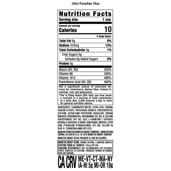 Ingredients: Carbonated Water, Citric Acid, Taurine, Sodium Citrate, Potassium Sorbate (preservative), Caffeine, Acesulfame Potassium, Sucralose, Sodium Benzoate (preservative). Niacinamide (vit. B3), D-calcium Pantothenate (vit. B5), Salt, L-carnitine L-tartrate, Natural & Artificial Flavors, Gum Arabic, Inositol, Ester Gum, Pyridoxine Hydrochloride (vit. B6), Yellow #5, Blue #1, Cyanocobalamin (vit. B12).